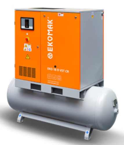 Маслозаполненные винтовые компрессоры Ekomak серии EKO GCRD оснащены редукторной передачей, которая позволяет передавать крутящий момент ещё более эффективно, чем привычный прямой привод. Блягодаря этому сократилось энергопотребление и увеличилась производительность. Также на все модели устанавливается винтовой блок Atlas Copco, отличающийся высокой надёжностью и качеством работы. Благодаря такой компановке, уровень шума компрессора составляет 63 дБ. Компрессор комплектуется двигателем IE3 класса F со степенью защиты IP55. В сборку также входят ресивер на 500 литров и рефрижераторный осушитель. Серия EKO GCRD дополнительно оснащается удобным и интуитивным контролером управления, фильтром сжатого воздуха, влагоотделителем и маслоотделителем.