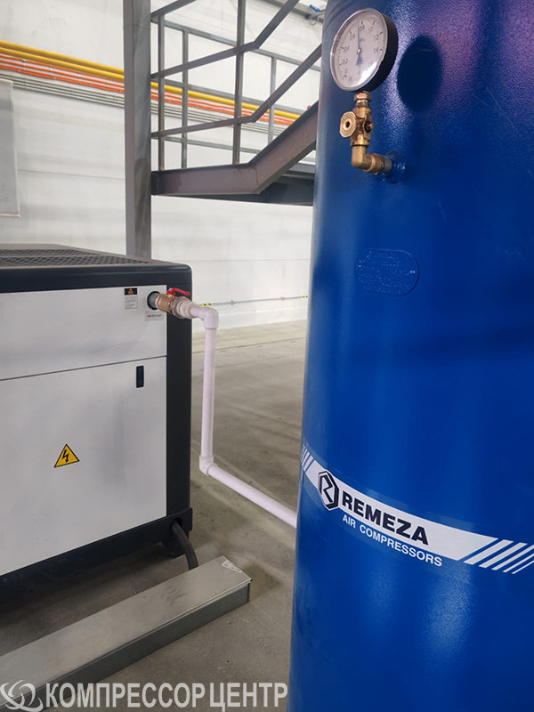 В комплект также были добавлены два вертикальных ресивера "Remeza" РВ 900.10.11, позволяющих накопить сжатый воздух и обеспечивать его равномерное распределение. Чтобы гарантировать высокое качество воздуха, мы интегрировали рефрижераторный осушитель "Ironmac" I-100 DIGI и магистральные фильтры различной степени очистки.